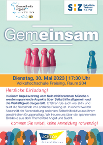 In einem Impulsvortrag vom Selbsthilfezentrum München werden spannende Aspekte über Selbsthilfe allgemein und die Vielfältigkeit dargestellt. Erfahren Sie auch wie aktiv und bunt die Selbsthilfe im Landkreis Freising ist. In einem zweiten Abschnitt der Veranstaltung berichten Selbsthilfeaktive aus ihrem persönlichen Gruppenalltag.